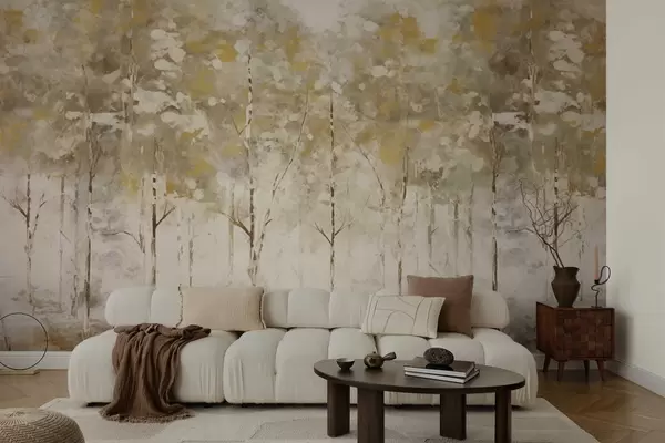 Papel tapiz Bosque estilizado con árboles esbeltos en tonos cálidos. Nr. w05221