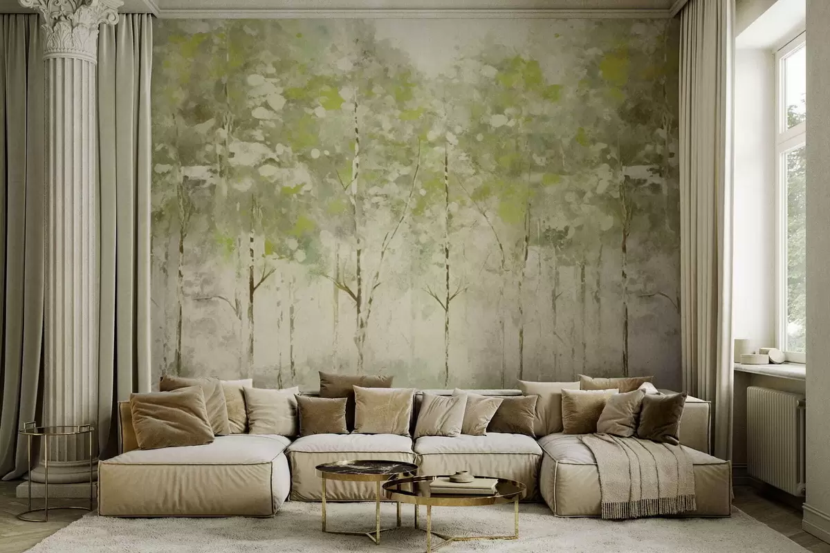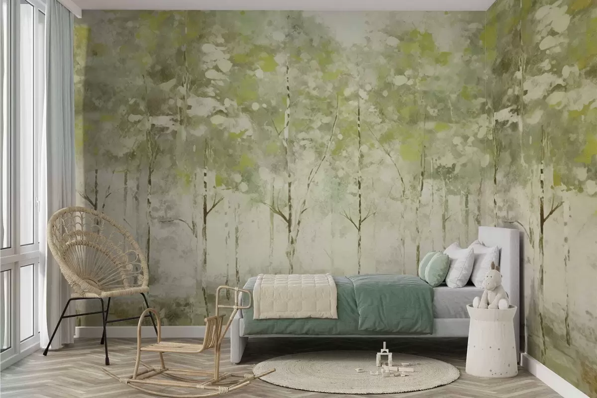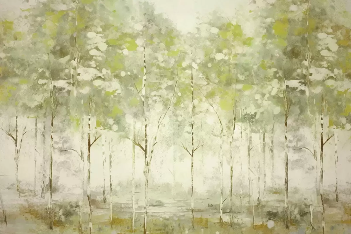 Papel tapiz Bosque estilizado con árboles esbeltos en tonos verdes. Nr. w05221v1