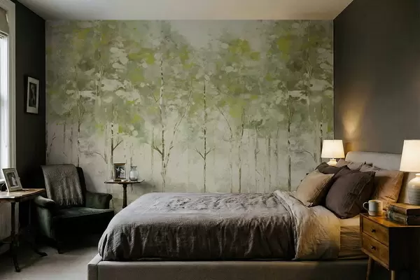 Papel tapiz Bosque estilizado con árboles esbeltos en tonos verdes. Nr. w05221v1