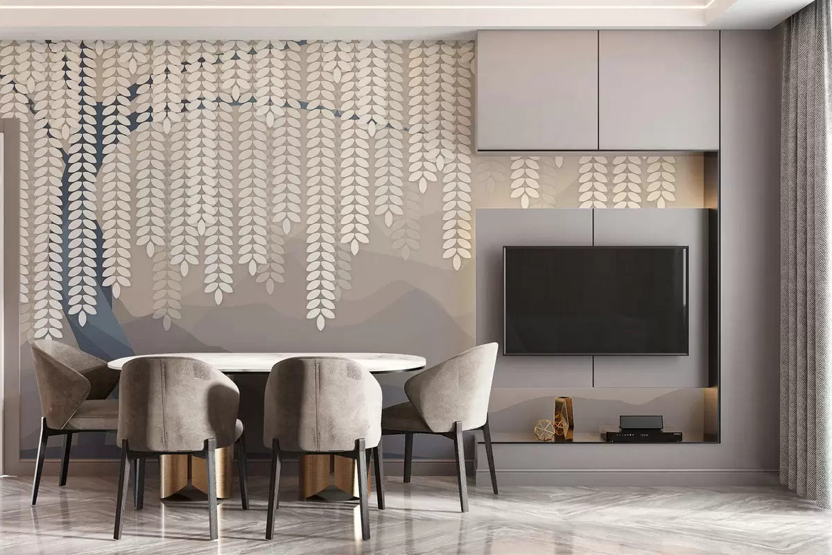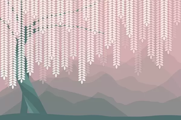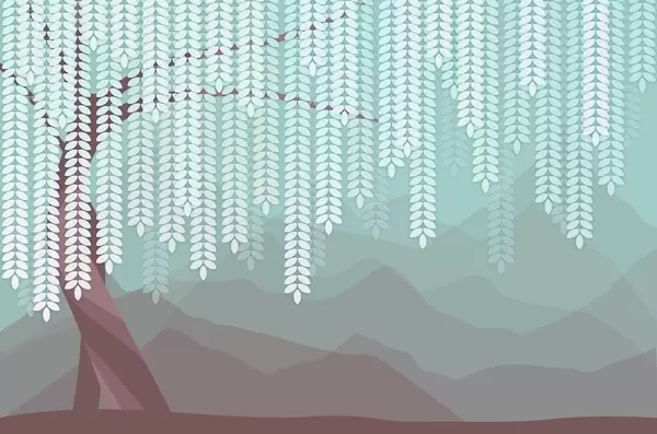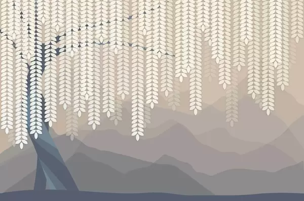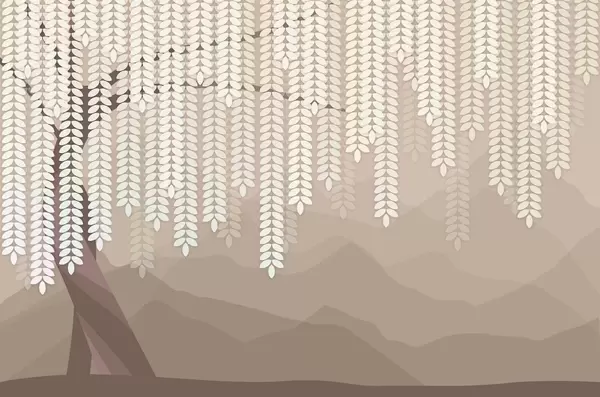Papel tapiz Sauce estilizado con hojas colgantes sobre un fondo de montañas minimalistas en tonos beige y azul verdoso. Nr. w05232
