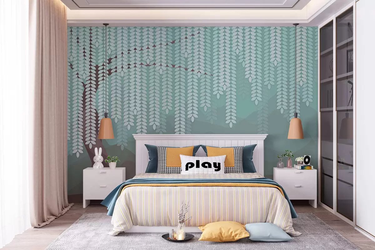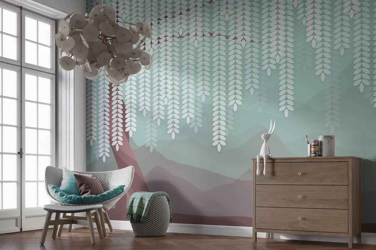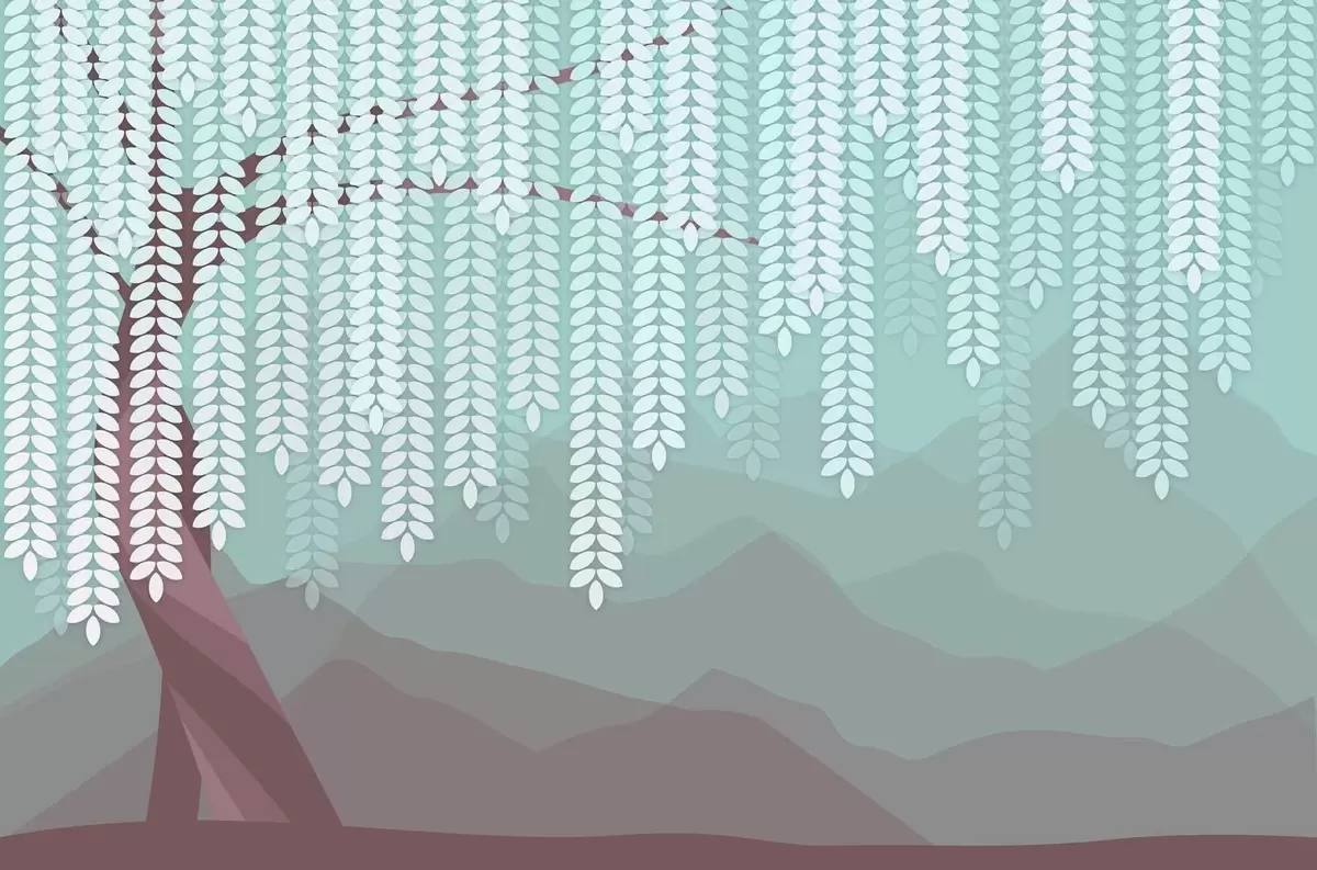 Papel tapiz Árbol de sauce estilizado con hojas colgantes sobre un fondo de montañas minimalistas en tonos chocolate y turquesa. Nr. w05232v1