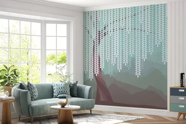 Papel tapiz Árbol de sauce estilizado con hojas colgantes sobre un fondo de montañas minimalistas en tonos chocolate y turquesa. Nr. w05232v1