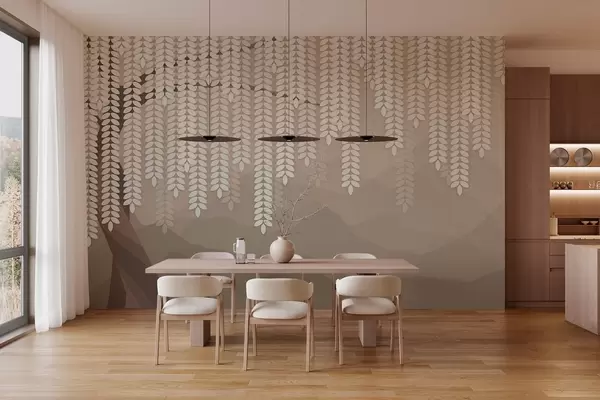 Papel tapiz Sauce estilizado con hojas colgantes sobre un fondo de montañas minimalistas en tonos café. Nr. w05232v2