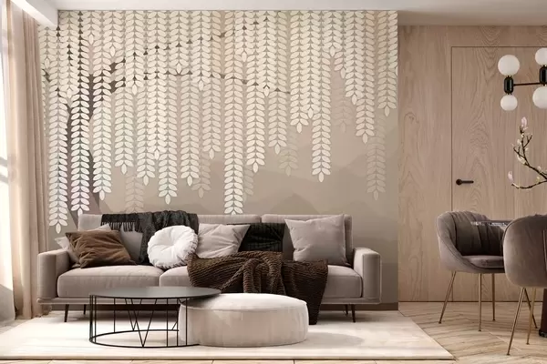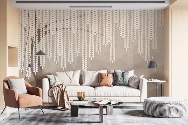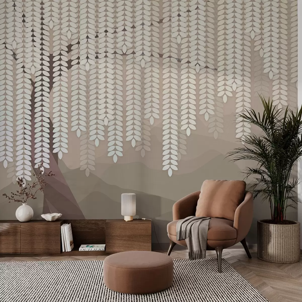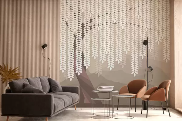 Papel tapiz Sauce estilizado con hojas colgantes sobre un fondo de montañas minimalistas en tonos café. Nr. w05232v2