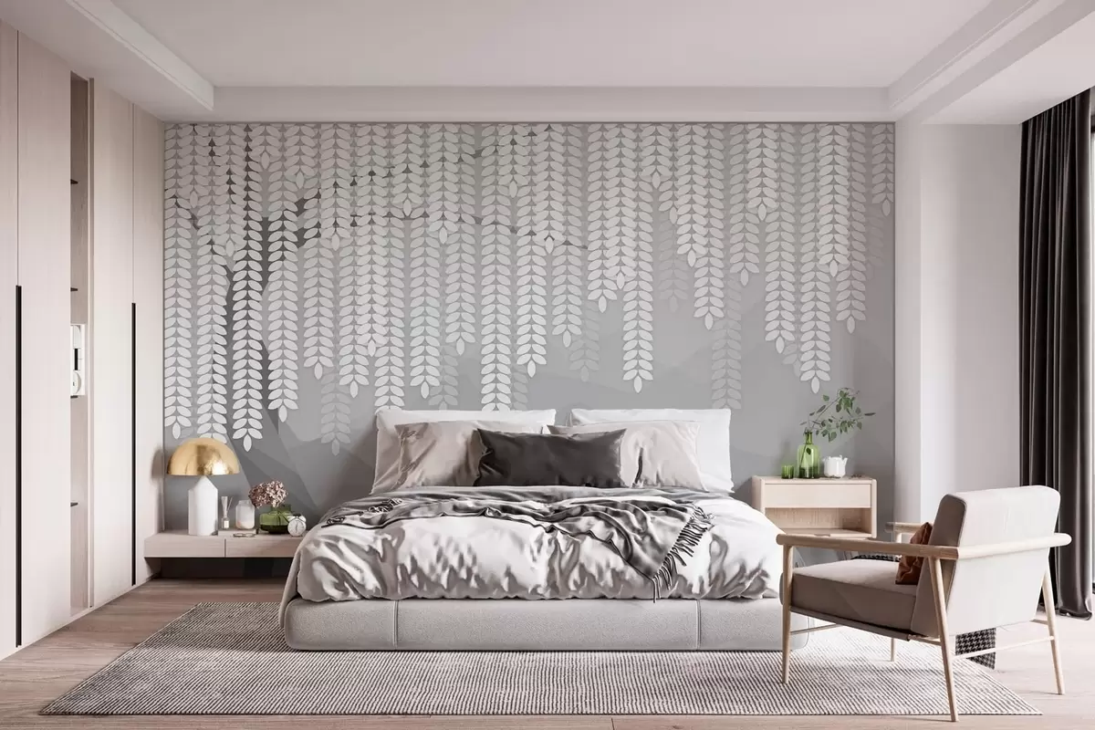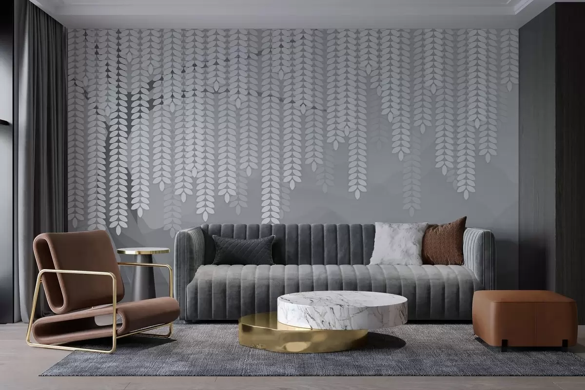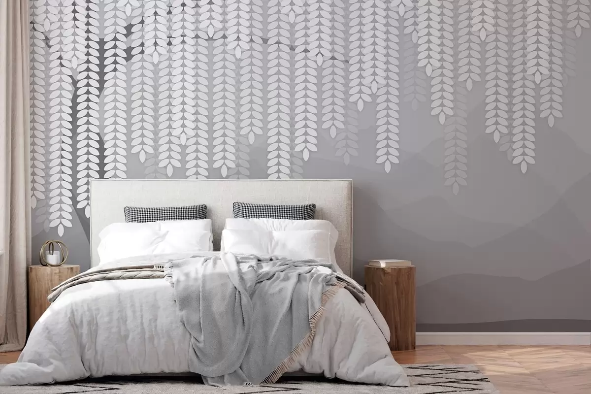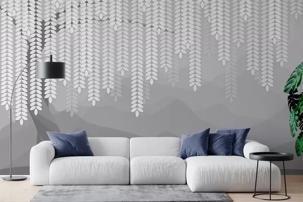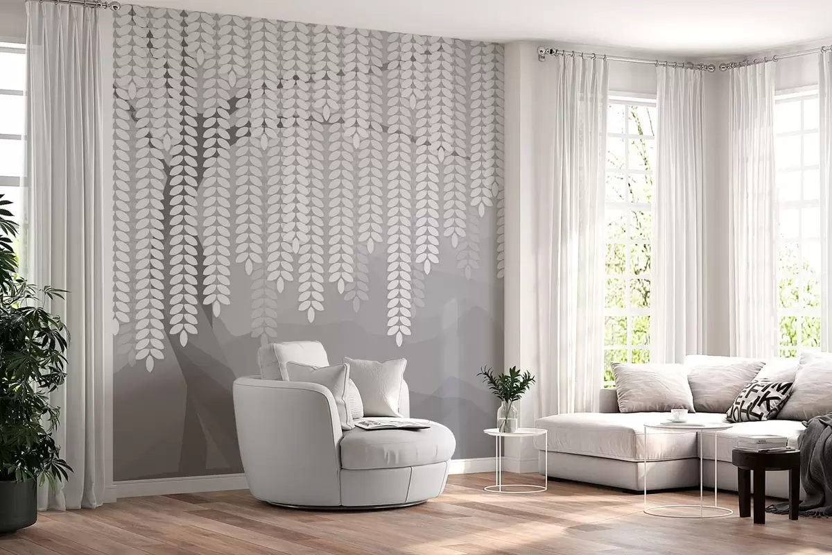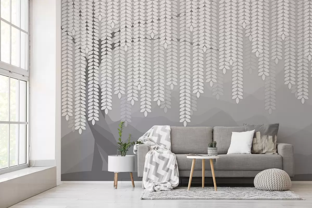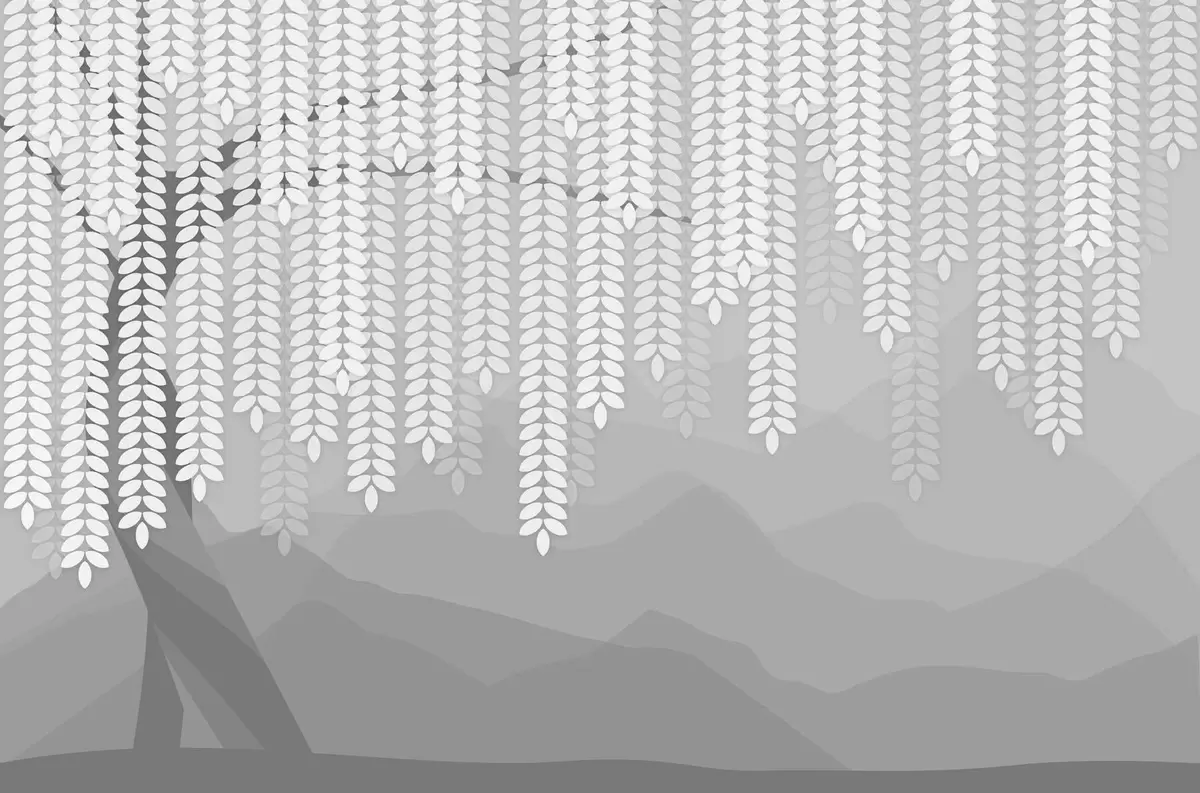 Papel tapiz Sauce estilizado con hojas colgantes sobre un fondo de montañas minimalistas en tonos grises. Nr. w05232v3