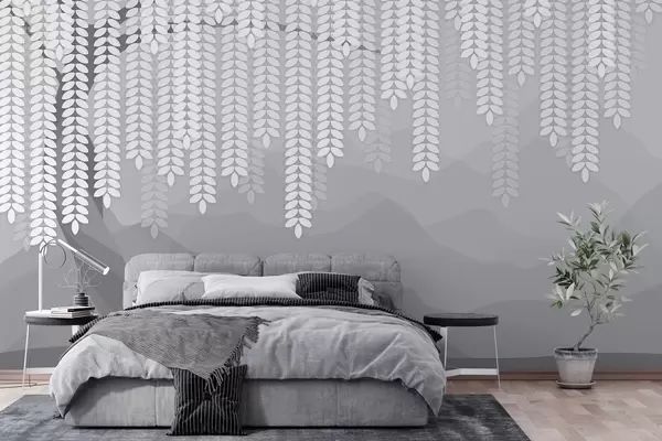 Papel tapiz Sauce estilizado con hojas colgantes sobre un fondo de montañas minimalistas en tonos grises. Nr. w05232v3
