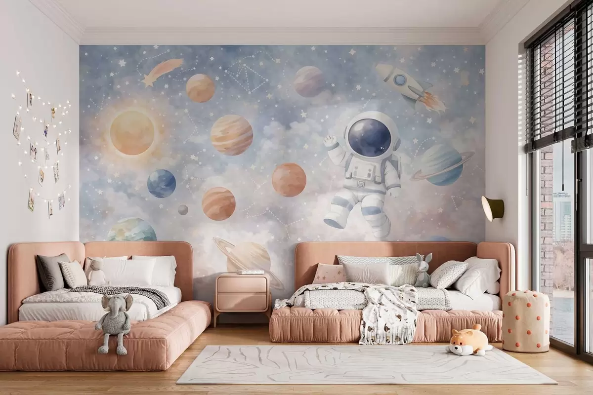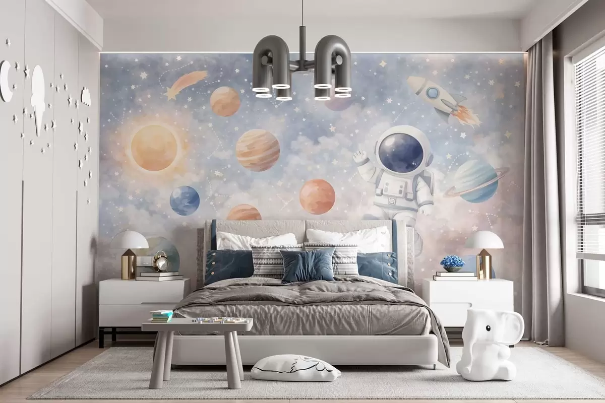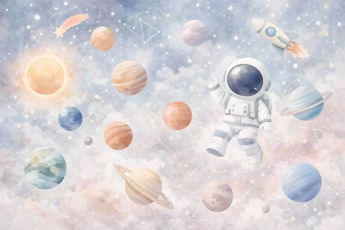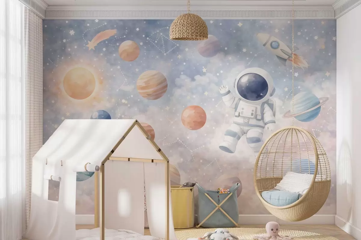 Papel tapiz Un pequeño astronauta entre planetas y estrellas. Nr. w05233