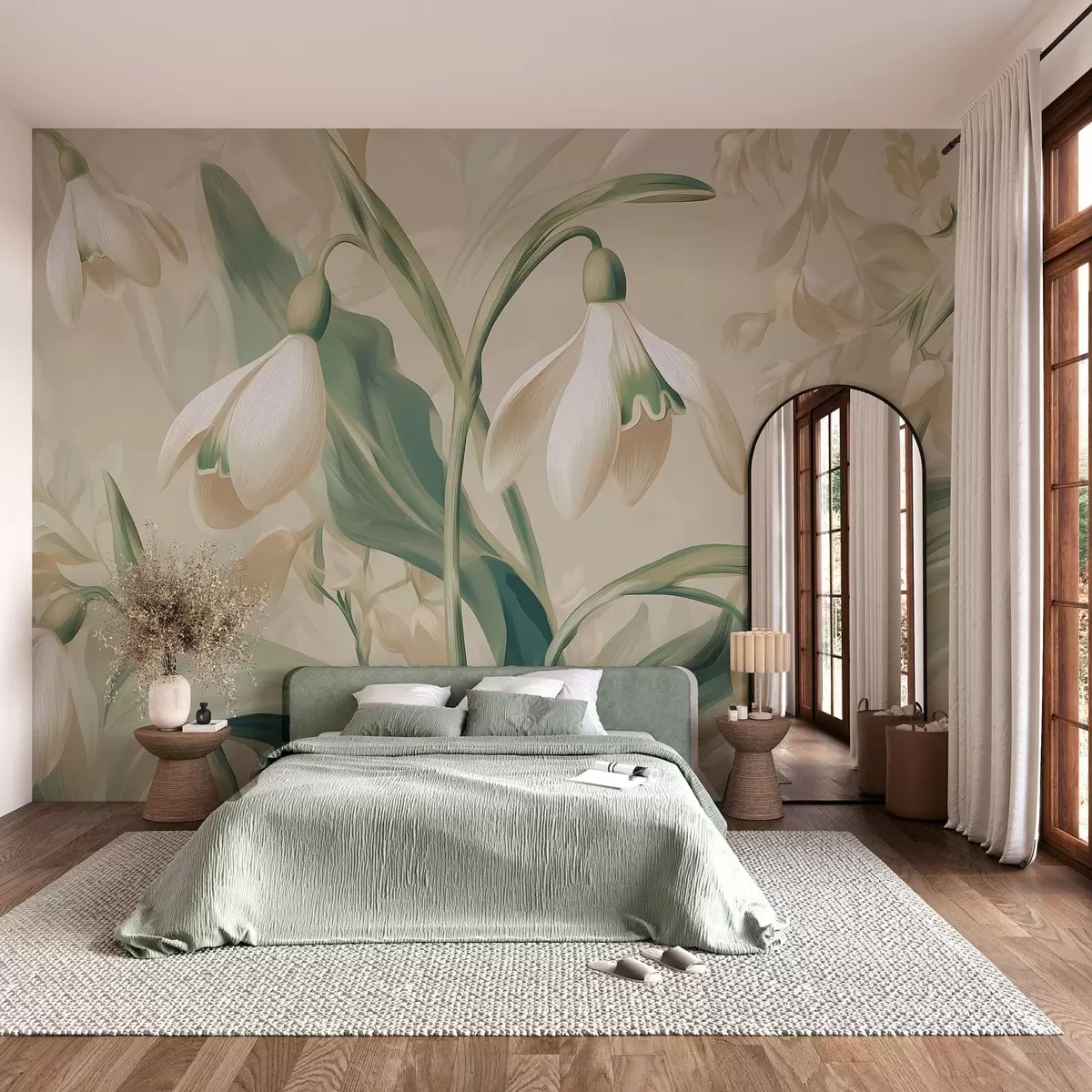Papel tapiz flores de nieve en flor sobre un fondo beige Nr. w05234