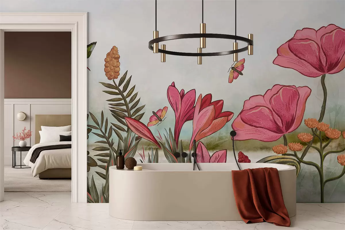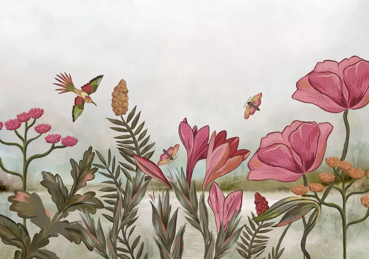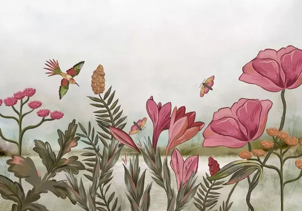 Papel tapiz Flores brillantes con pájaros y mariposas Nr. w05321