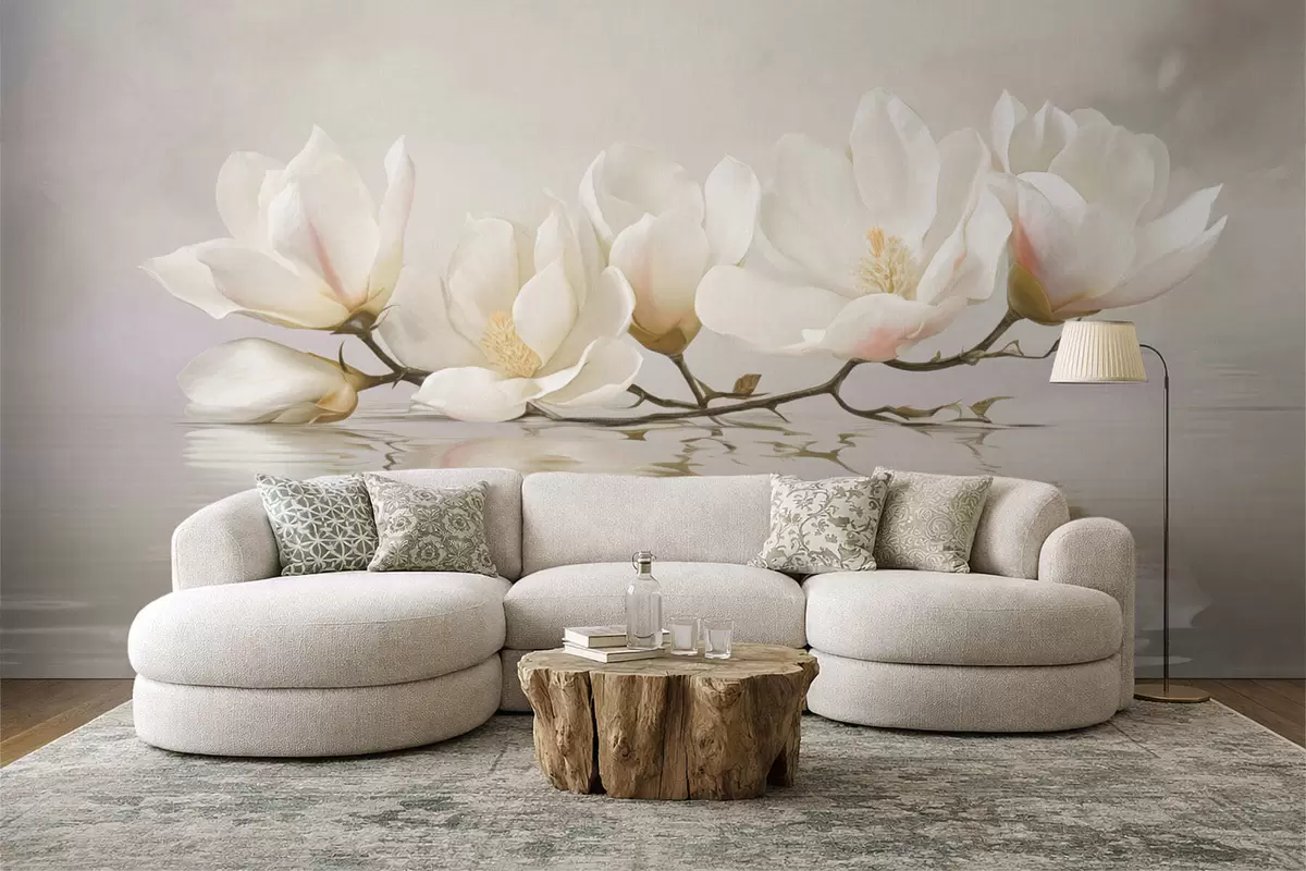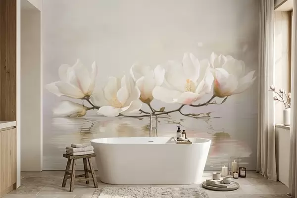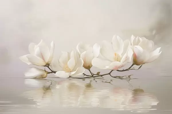Papel tapiz Ligeras flores de magnolia en una rama sobre el reflejo del agua. Nr. w05353