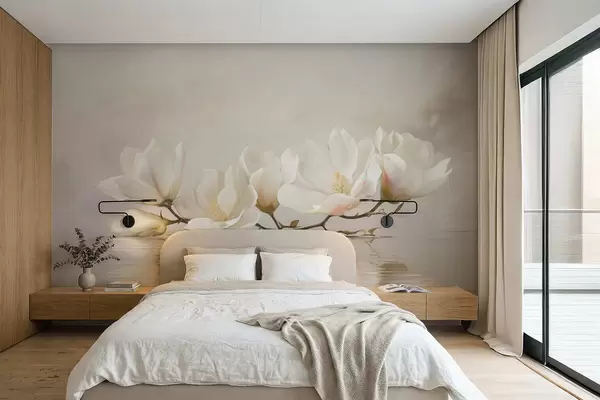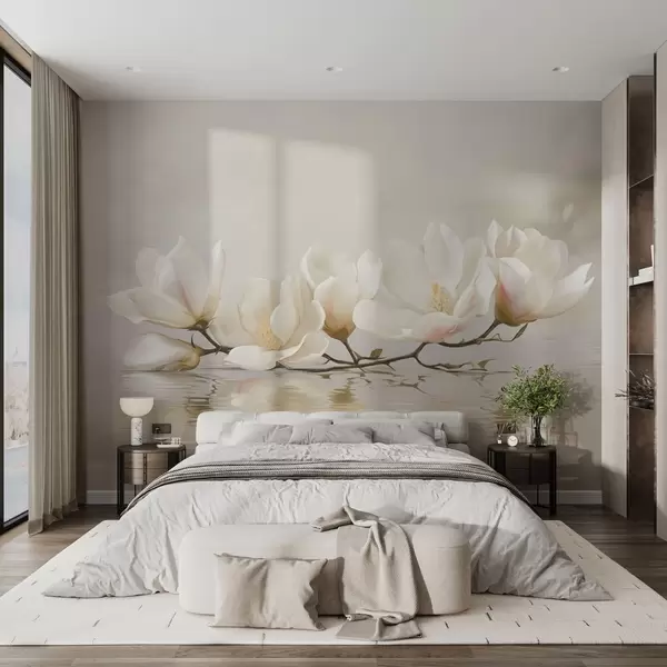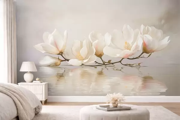 Papel tapiz Ligeras flores de magnolia en una rama sobre el reflejo del agua. Nr. w05353