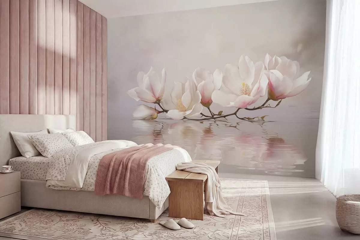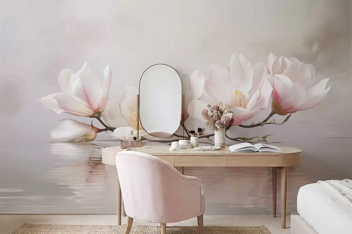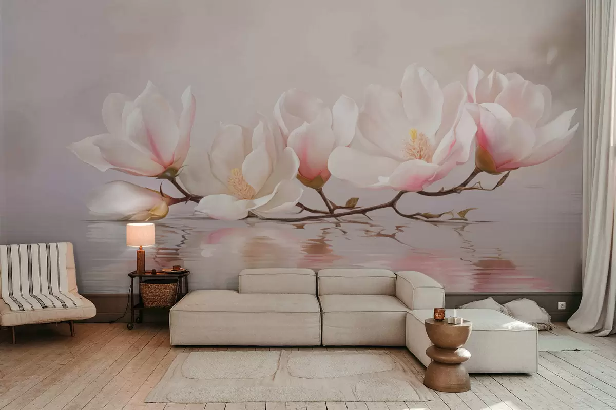 Papel tapiz Rama de magnolia con flores sobre el reflejo de aguas tranquilas Nr. w05353v1