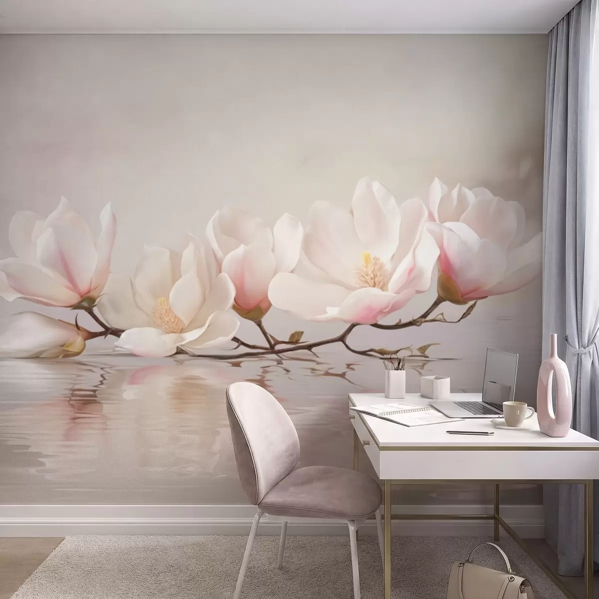 Papel tapiz Rama de magnolia con flores sobre el reflejo de aguas tranquilas Nr. w05353v1