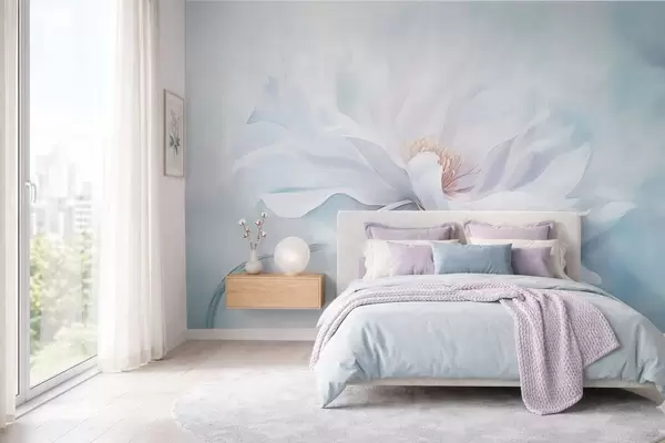Papel tapiz Flor blanca suave con pétalos fluidos sobre fondo azul. Nr. w05354
