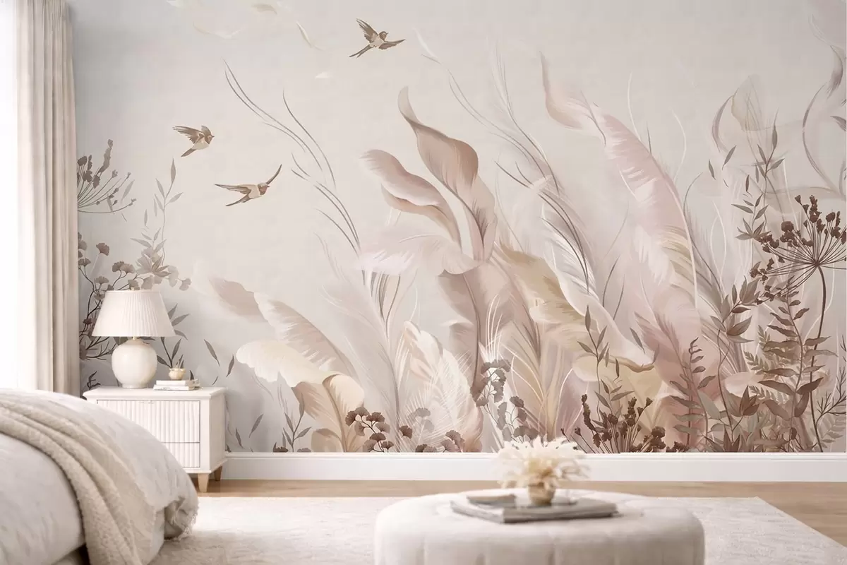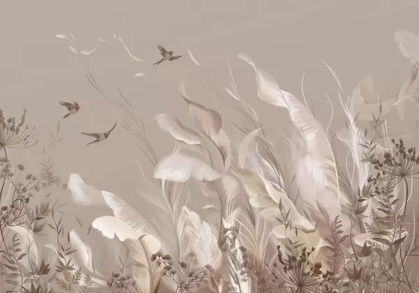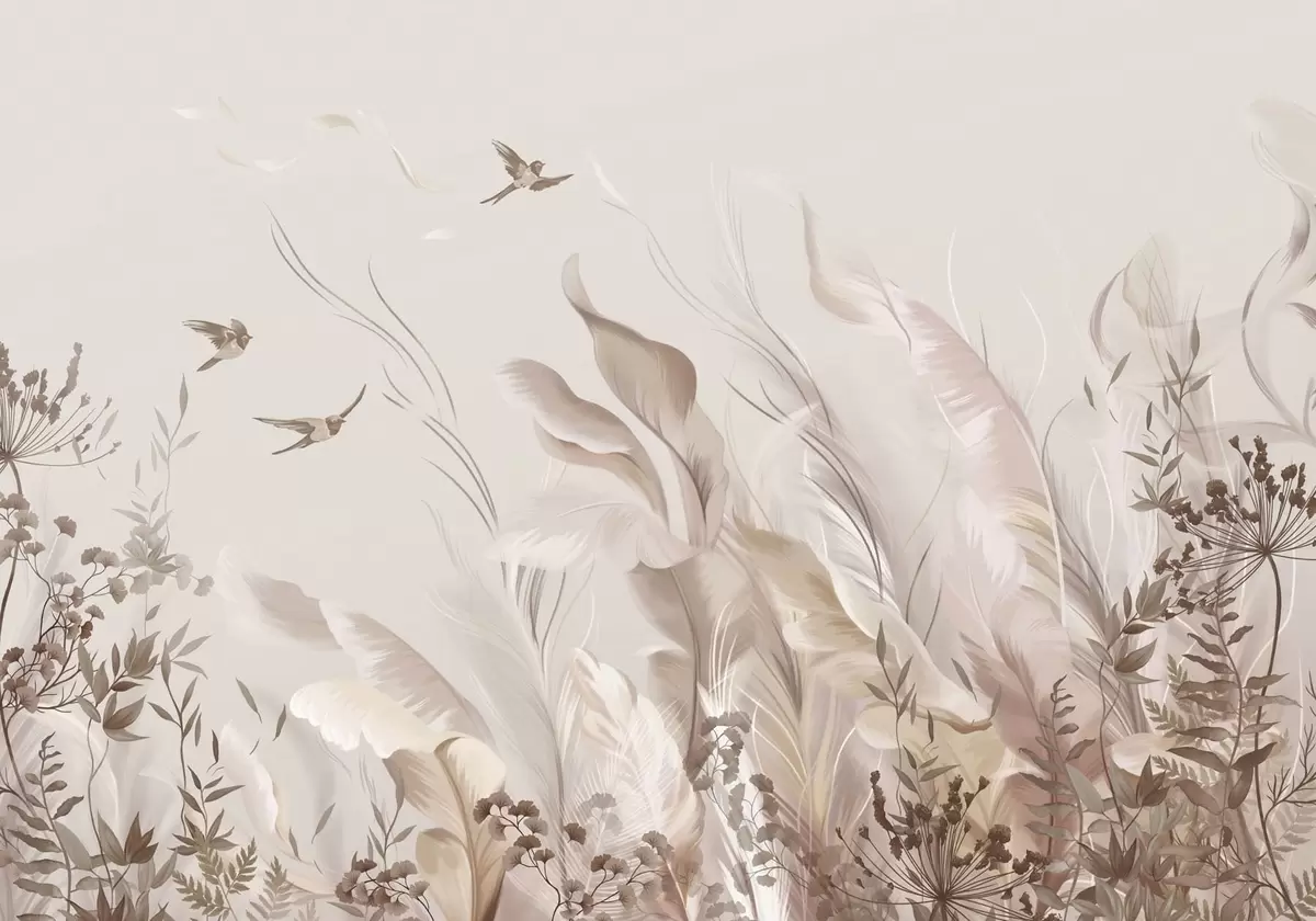 Papel tapiz Plumas suaves, hierbas y pájaros en tonos claros Nr. w05395