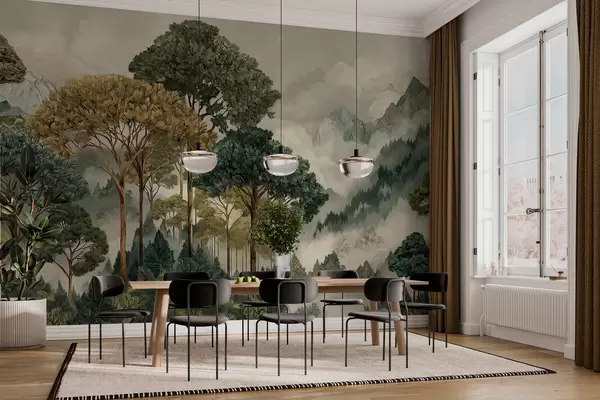 Papel tapiz Bosque con árboles altos en montañas envueltas en niebla Nr. w05410