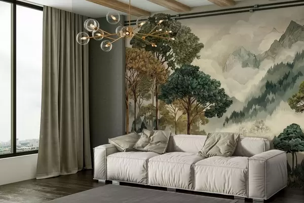 Papel tapiz Bosque con árboles altos en montañas envueltas en niebla Nr. w05410