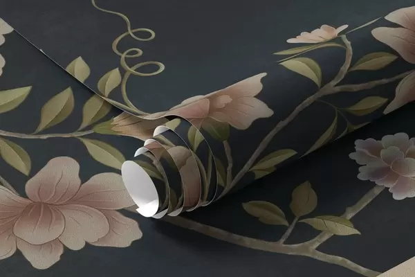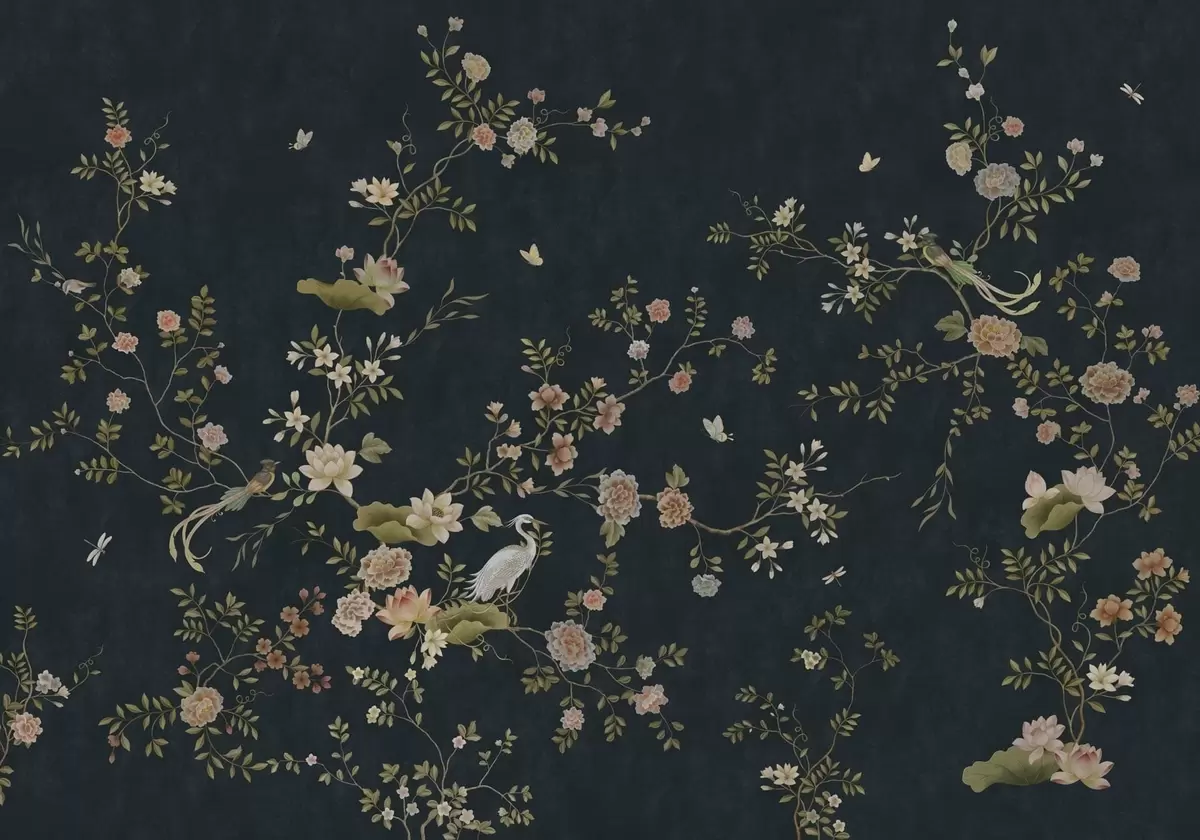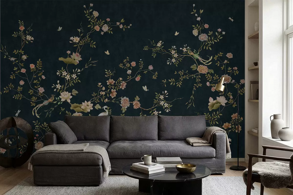 Papel tapiz Ramas en flor con pájaros sobre fondo oscuro Nr. w05416v3