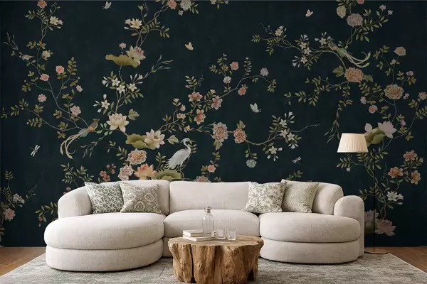 Papel tapiz Ramas en flor con pájaros sobre fondo oscuro Nr. w05416v3