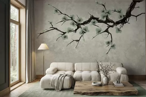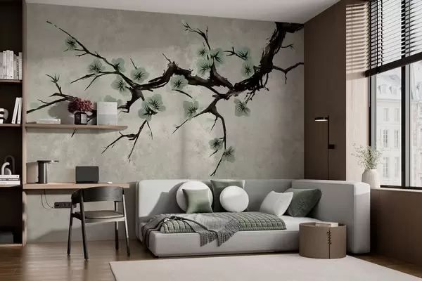 Papel tapiz Rama con flores verdes en tonos suaves Nr. w05425v2