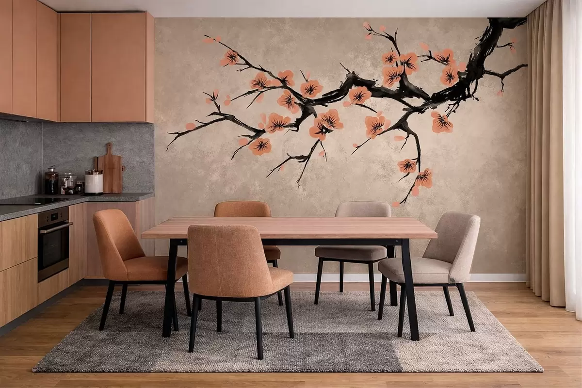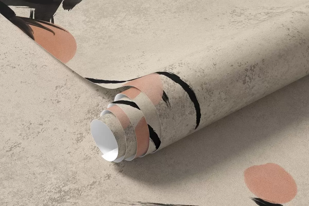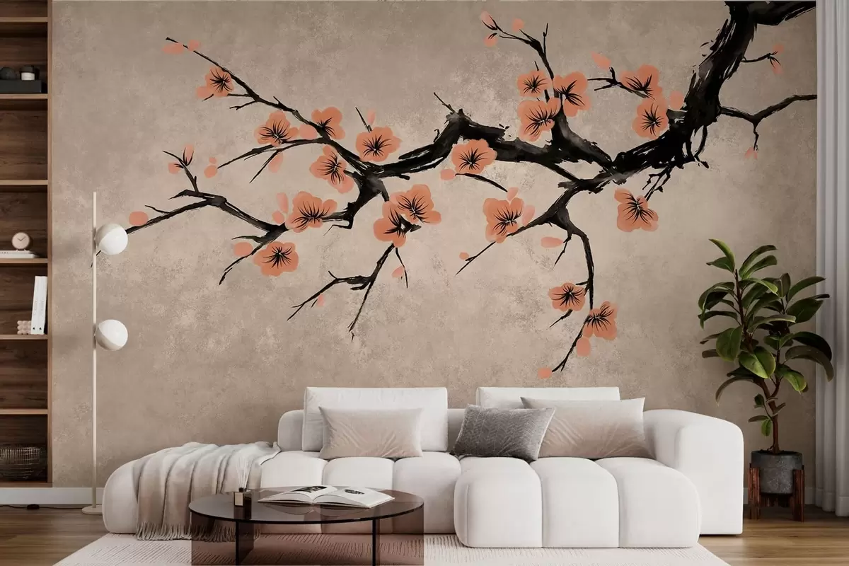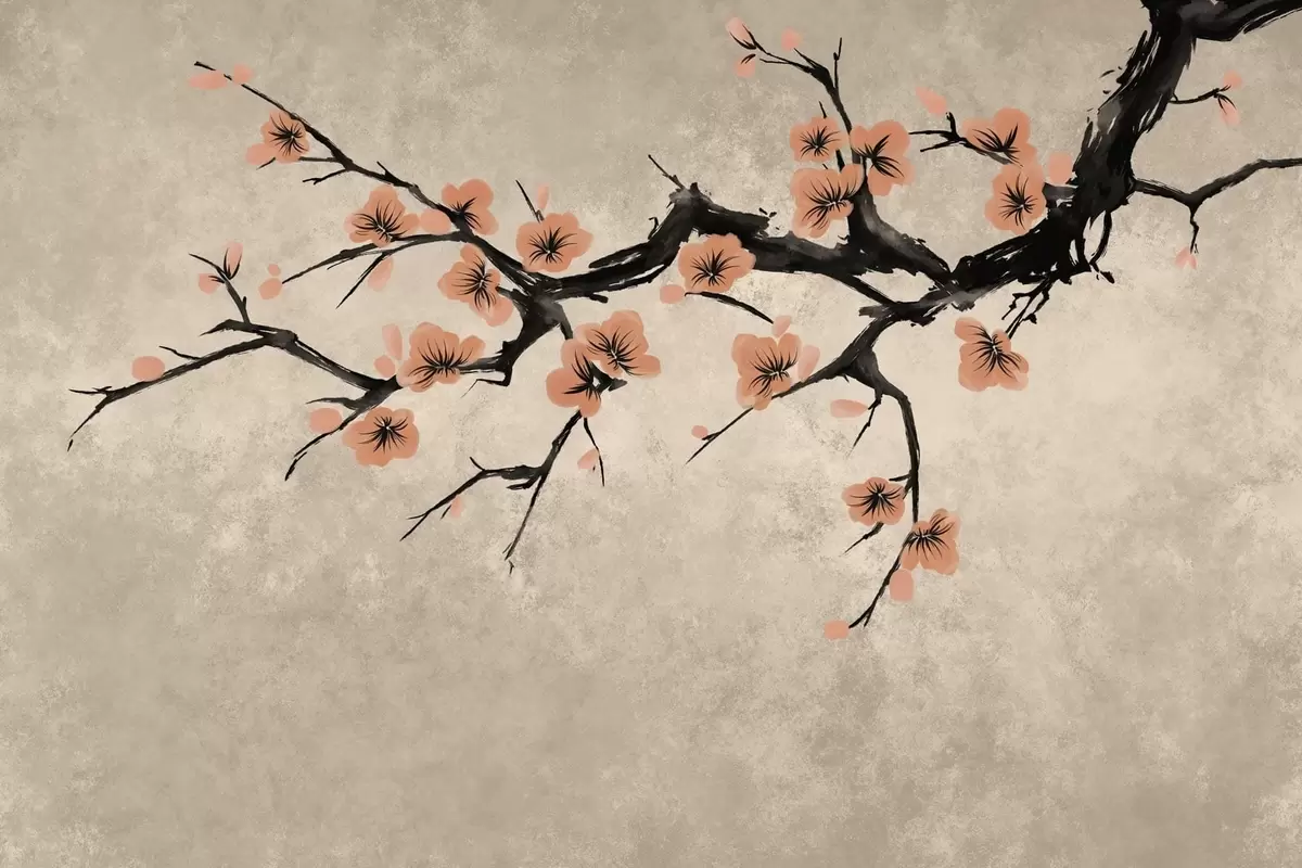 Papel tapiz Rama con flores de melocotonero sobre un fondo texturizado Nr. w05425v3