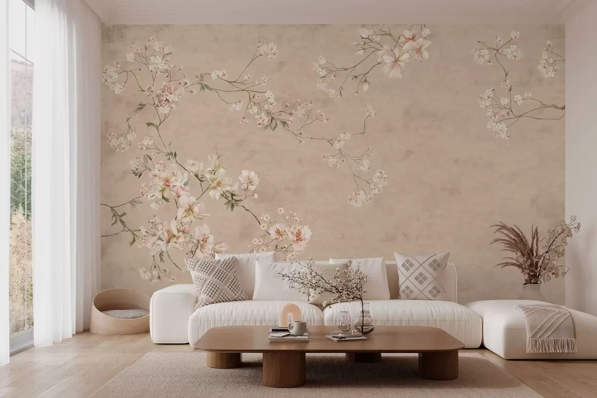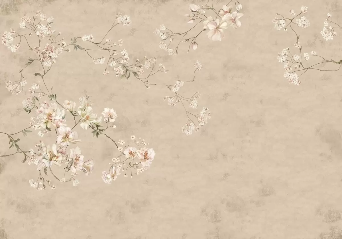 Papel tapiz Ramas florales de estilo chinoiserie sobre un fondo beige cálido Nr. w05427v2