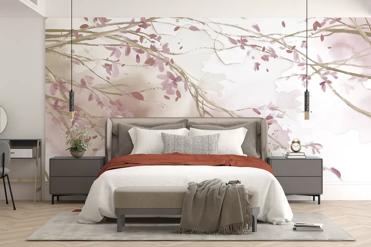 Papel tapiz Delicadas ramas florales rosas y blancas con fondo de acuarela suave y borroso Nr. w07919v1