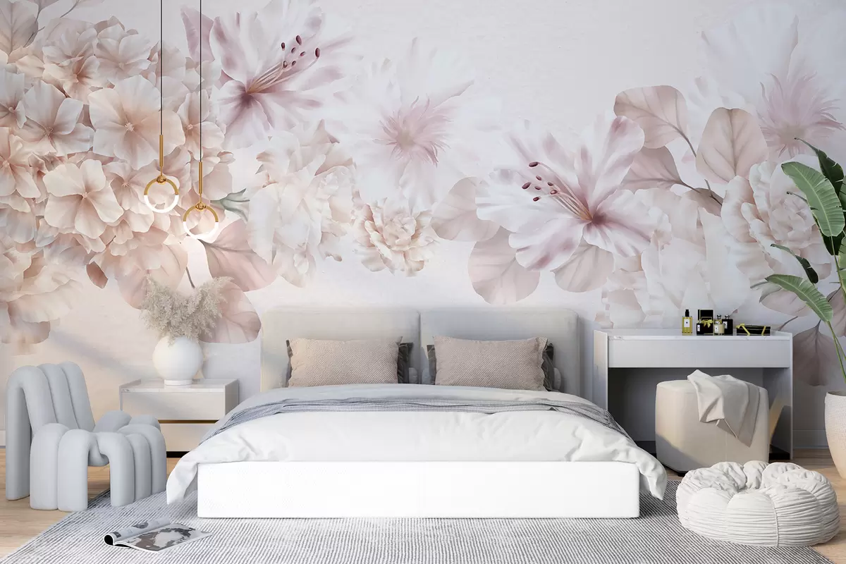 Papel tapiz Arreglo floral rosa suave y blanco, con delicados pétalos y flores sobre un fondo claro Nr. w07923