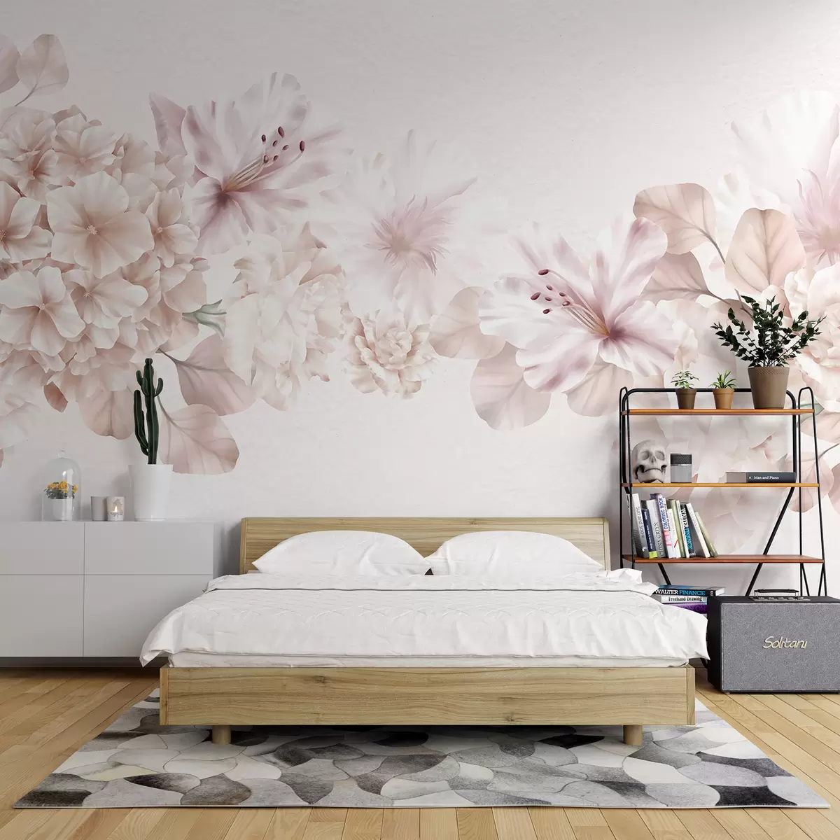 Papel tapiz Arreglo floral rosa suave y blanco, con delicados pétalos y flores sobre un fondo claro Nr. w07923