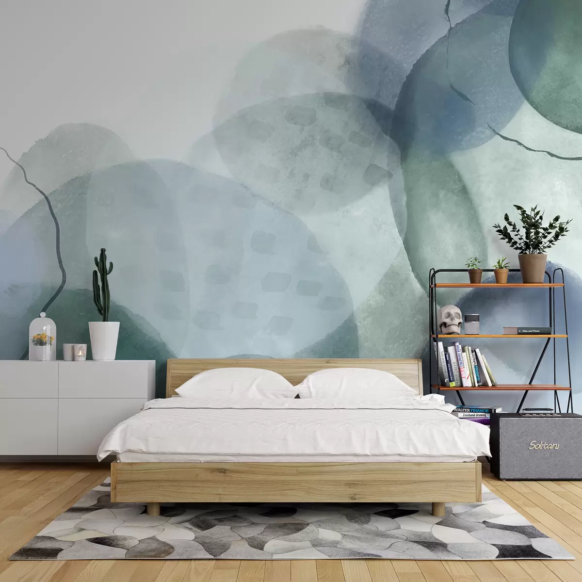 Papel tapiz Formas abstractas suaves de acuarela en tonos de azul, verde y blanco. Nr. w07926