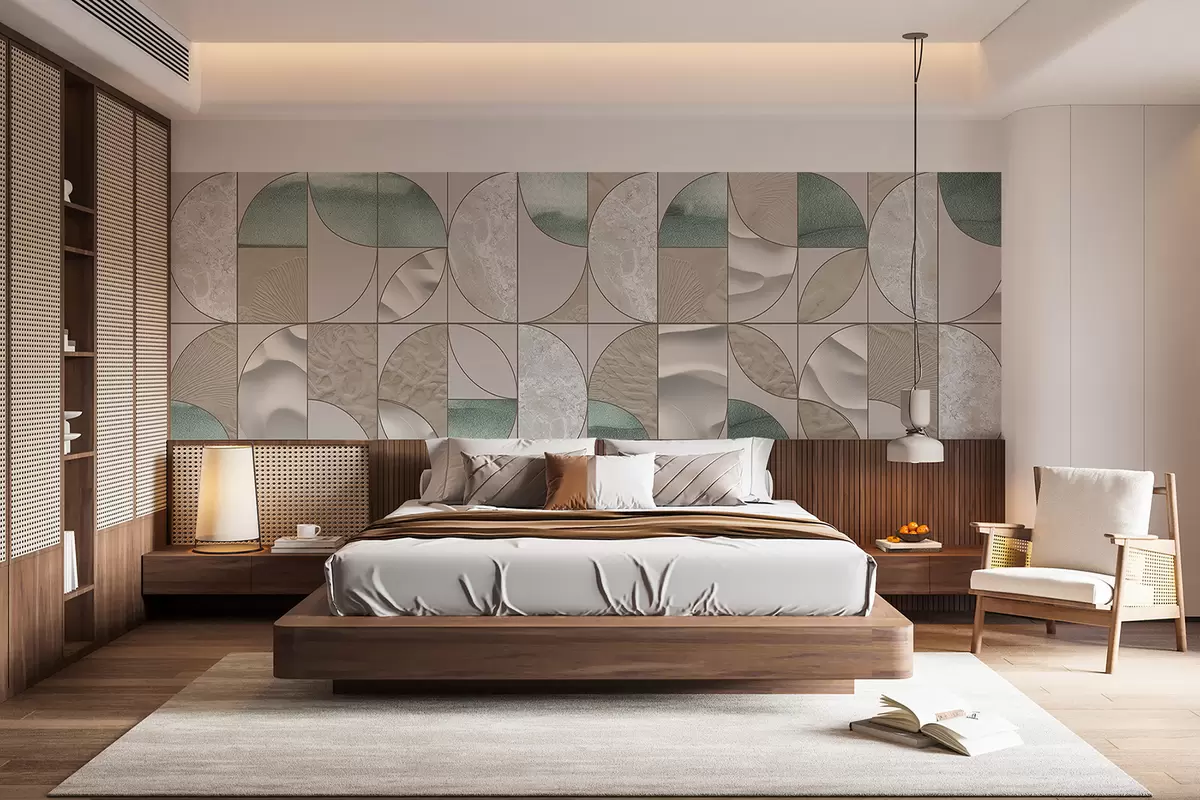 Papel tapiz Un patrón geométrico de texturas verdes, beige y blancas dispuestas en un diseño abstracto repetitivo Nr. w07928