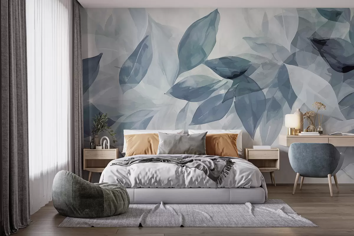 Papel tapiz Hojas de acuarela suaves en gris y blanco con un fondo etéreo y borroso Nr. w07981