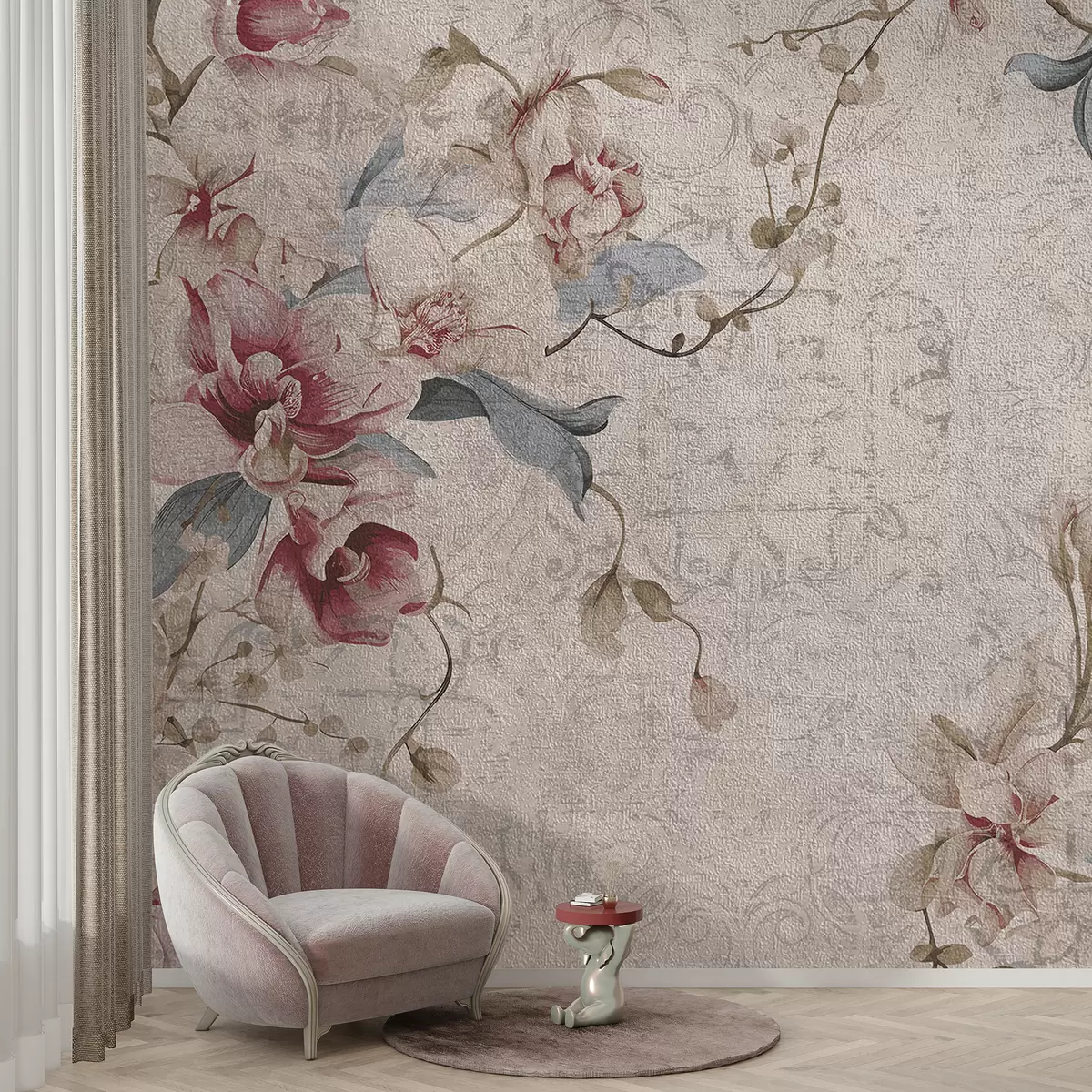 Papel tapiz Un patrón floral vintage con delicadas flores rosas y blancas, hojas sobre un fondo beige claro. Nr. w08149
