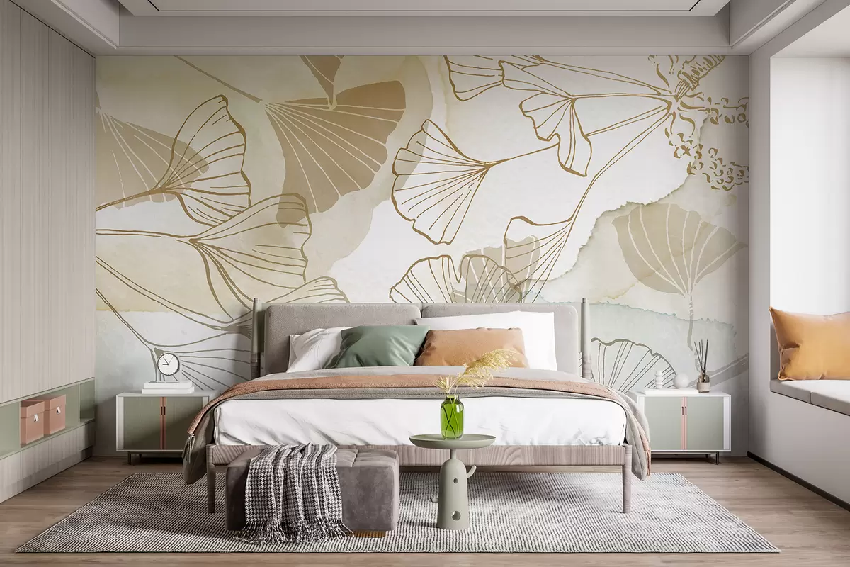 Papel tapiz Un patrón de delicadas hojas de ginkgo en tonos beige, tostado y azul sobre un fondo claro. Nr. w08157