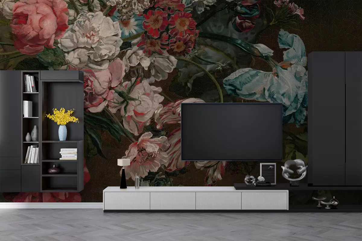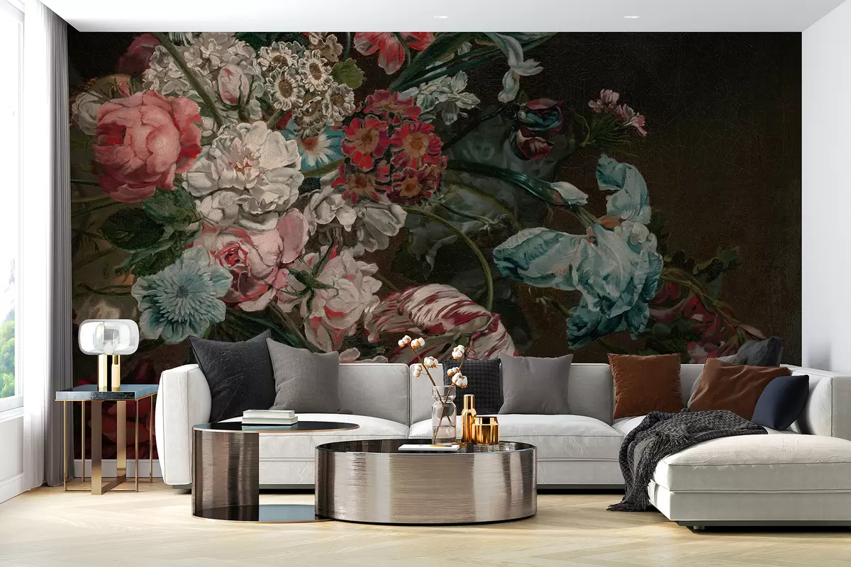 murales de pared Flores coloridas vintage que incluyen peonías rosas, claveles rojos y lirios blancos sobre un fondo oscuro. w08163