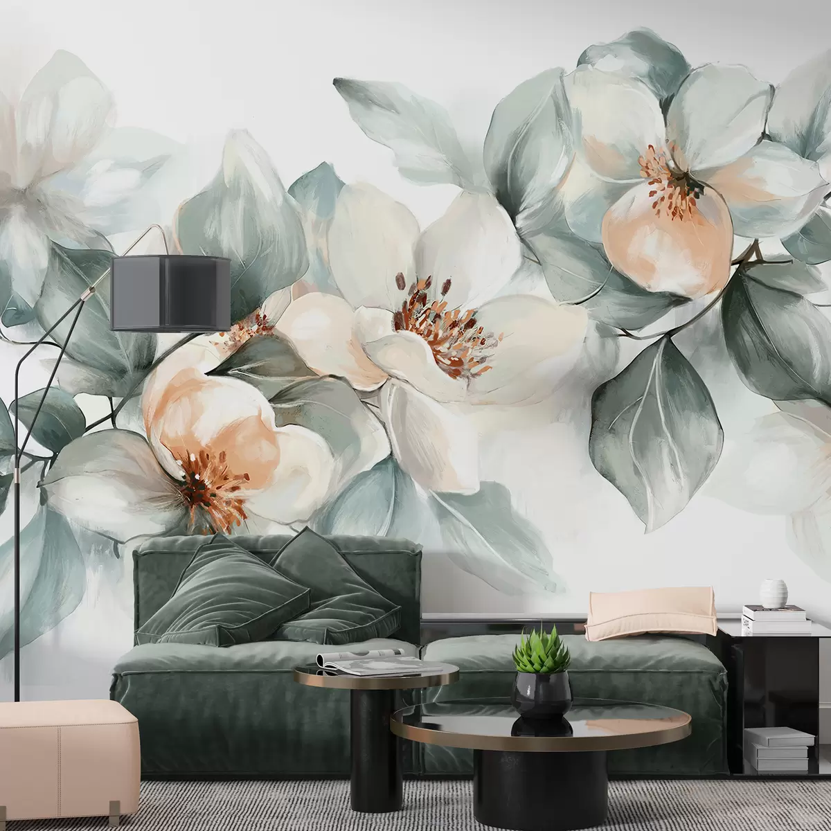 Papel tapiz Delicadas flores de magnolia blancas y rosas con hojas verdes suaves sobre un fondo claro Nr. w08220