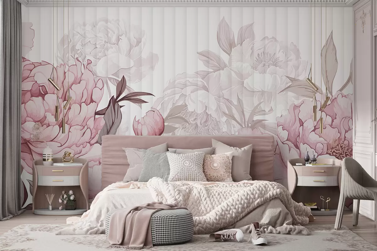 Papel tapiz Primer plano de grandes y delicadas flores de peonía rosas y blancas sobre un fondo suave y texturado Nr. w08255