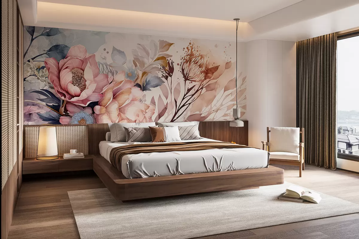 Papel tapiz Grandes flores rosas y azules con delicados pétalos, rodeadas de flores más pequeñas sobre un fondo de acuarela Nr. w08256