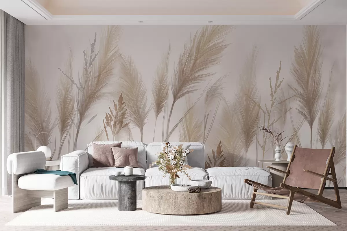 Papel tapiz Altas espiguillas de hierba beige mecidas por el viento sobre un fondo suave y claro Nr. w08268