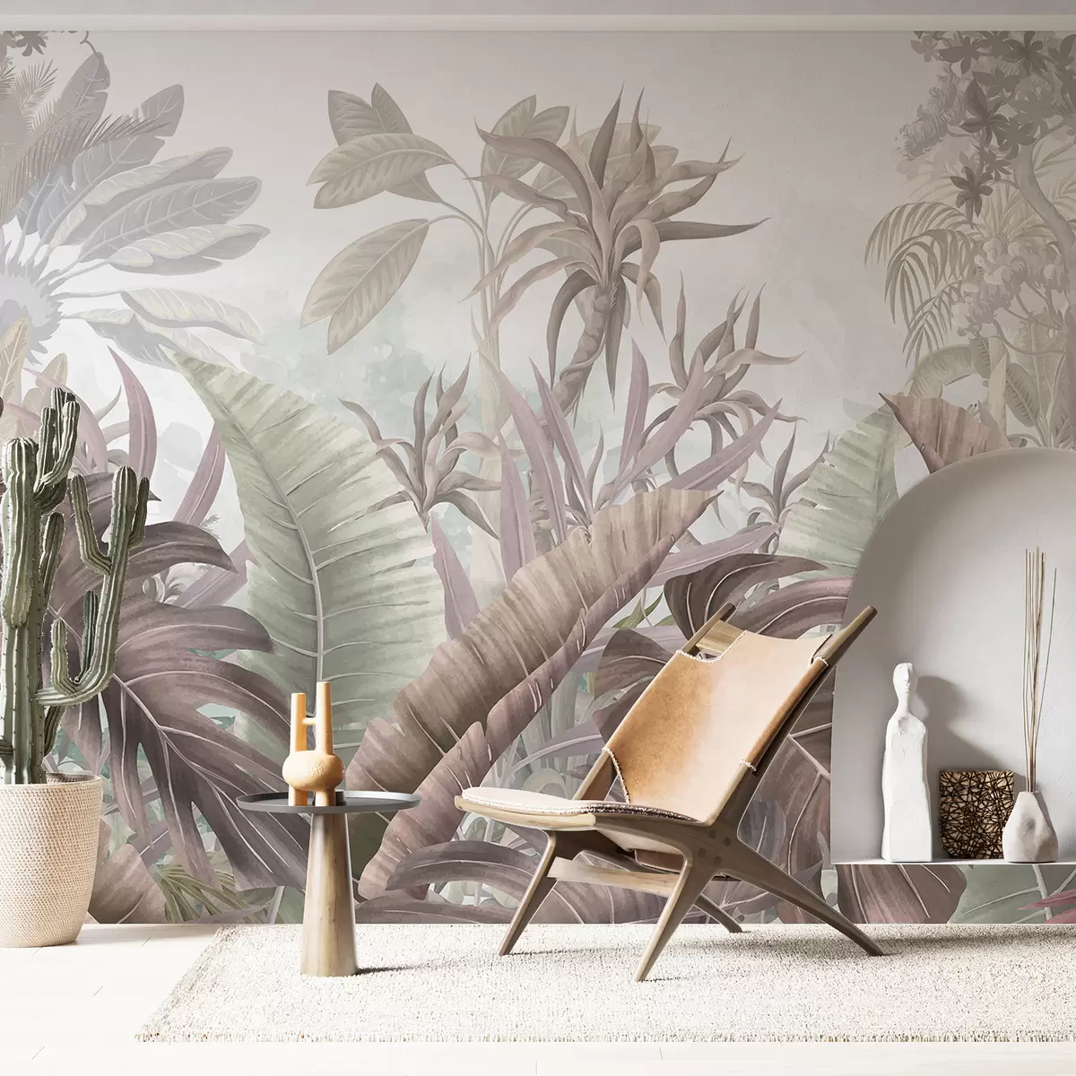 Papel tapiz Una jungla tropical con grandes hojas de palmera y plantas exóticas en tonos grises, blancos y beige Nr. w08307