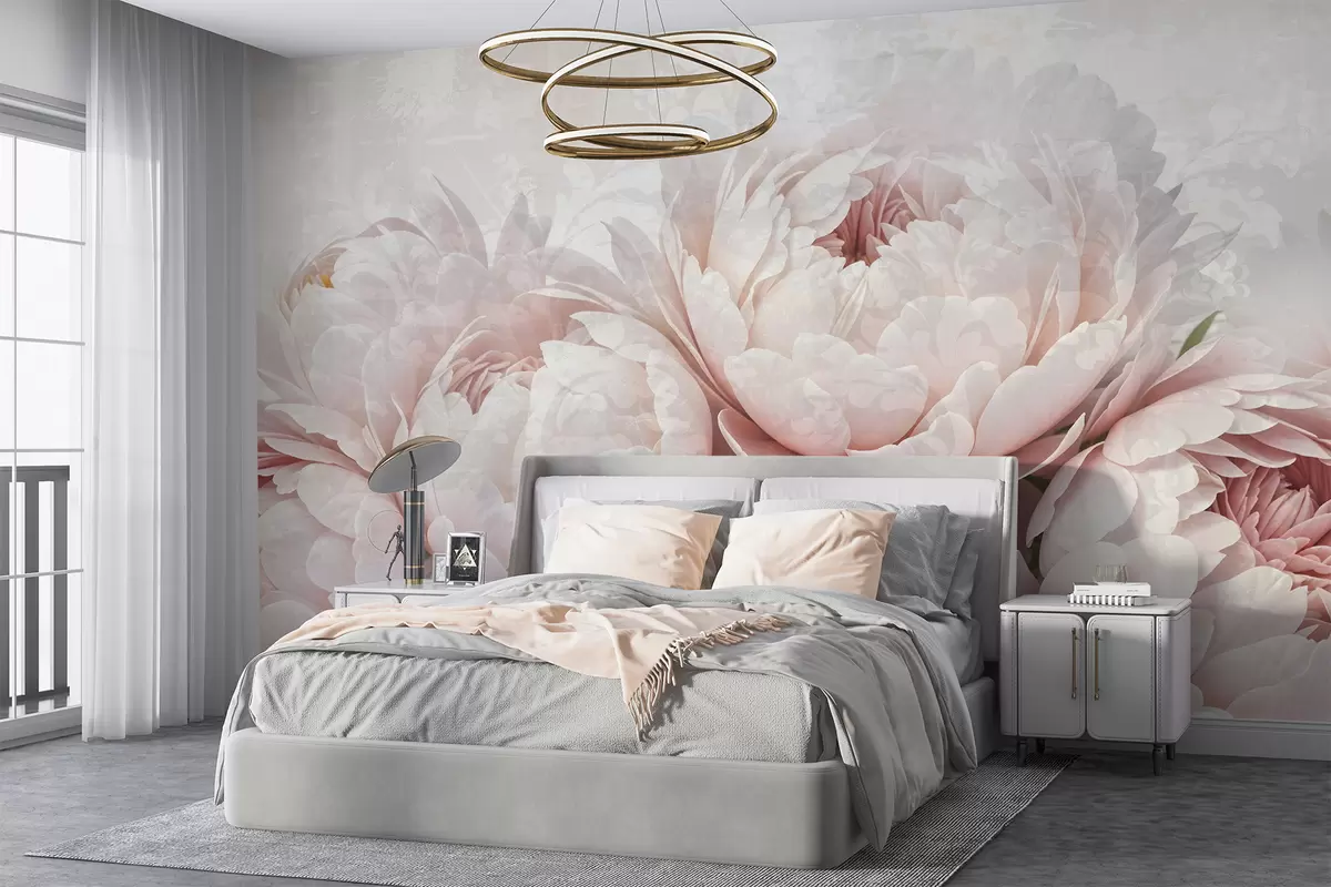 Papel tapiz Peonías de color rosa suave con delicados pétalos sobre un fondo vintage de textura ligera Nr. w08312