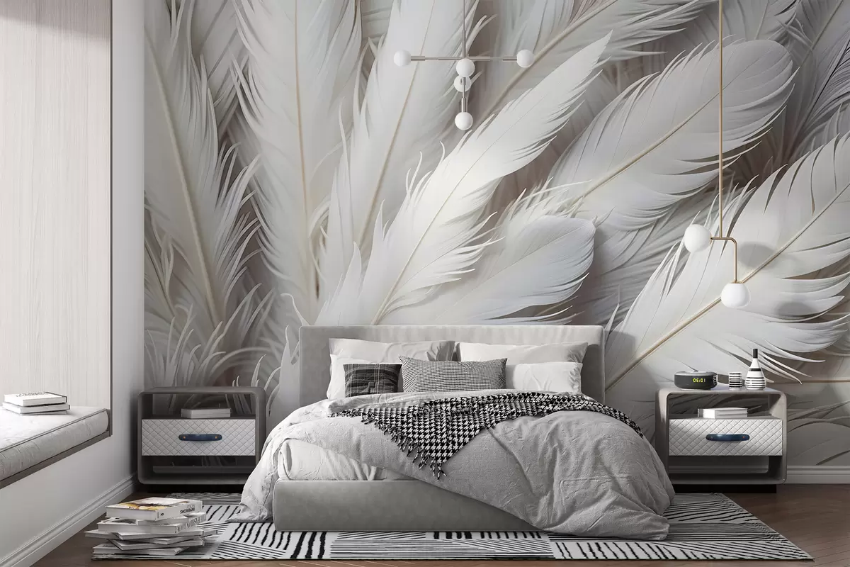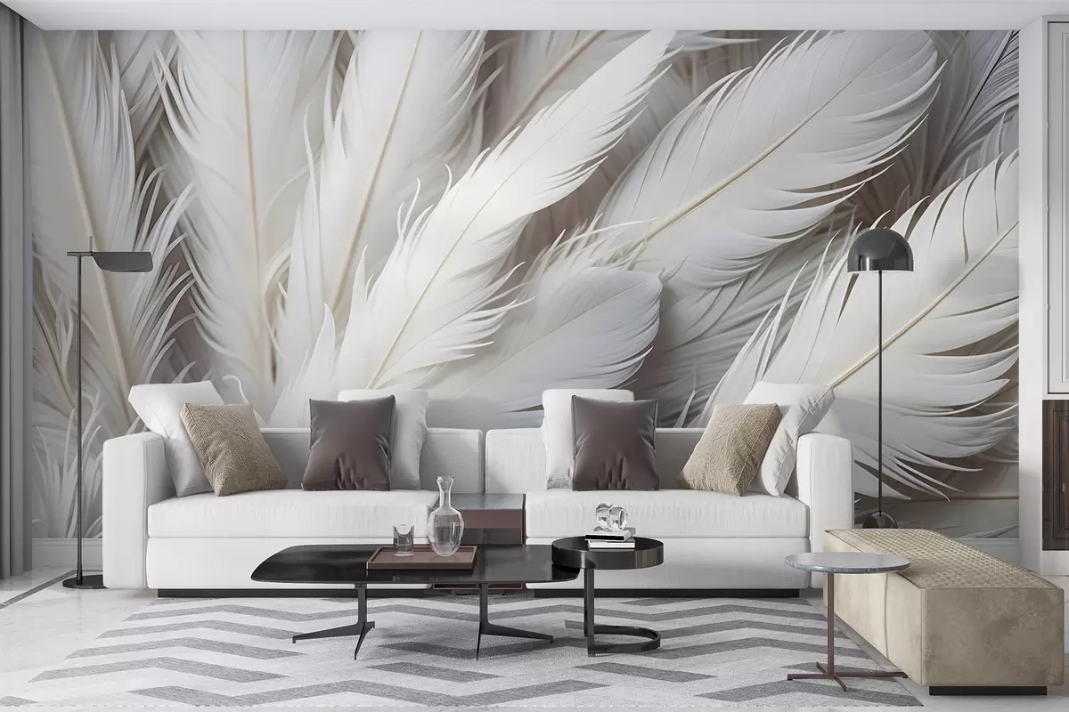 murales de pared Suaves y esponjosas plumas blancas con una delicada textura ondulada sobre un fondo claro w08319