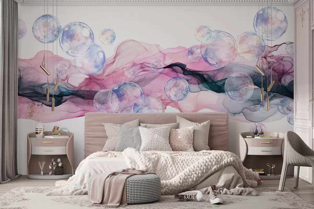 Papel tapiz Coloridas formas fluidas abstractas con burbujas, remolinos de tonos rosas, azules y morados sobre fondo blanco Nr. w08337