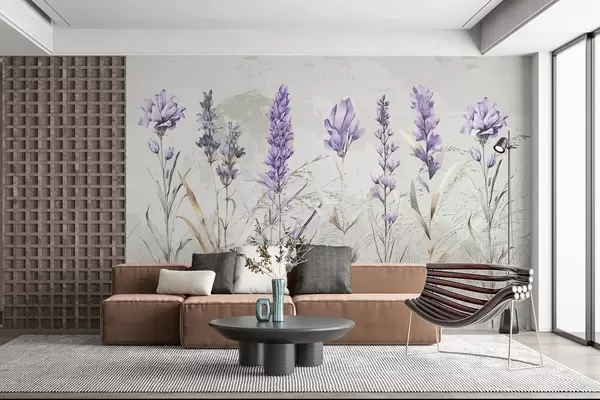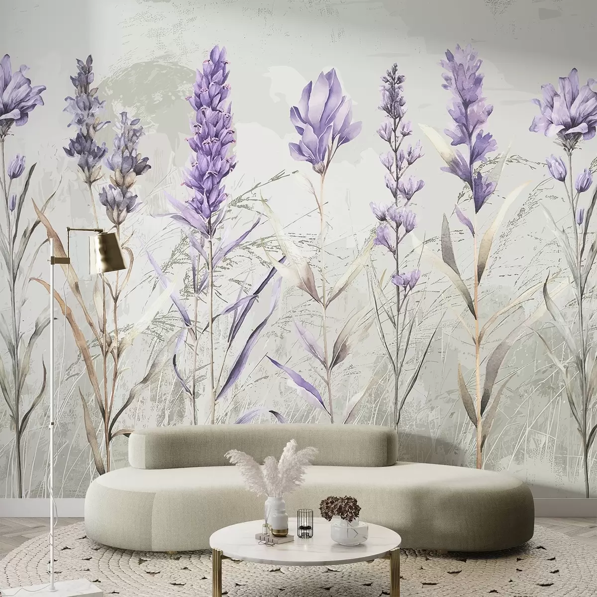 Papel tapiz Un campo de flores de lavanda de acuarela púrpura con fondo beige de textura suave y borrosa Nr. w08346
