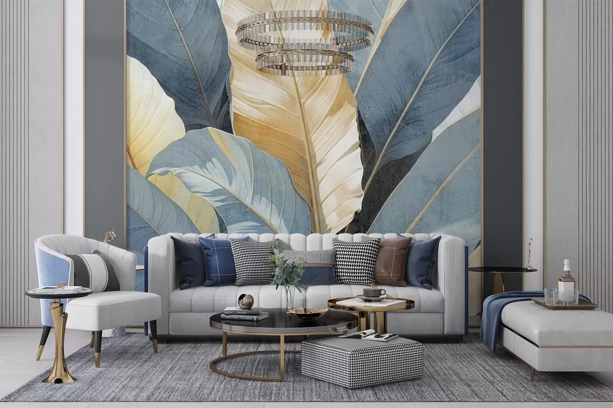 Papel tapiz Primer plano de grandes y exuberantes hojas tropicales decorativas con textura en tonos azules, verdes y amarillos Nr. w08373