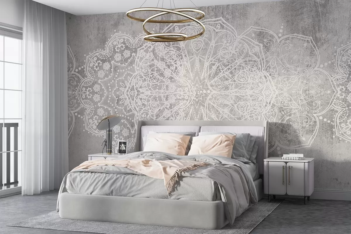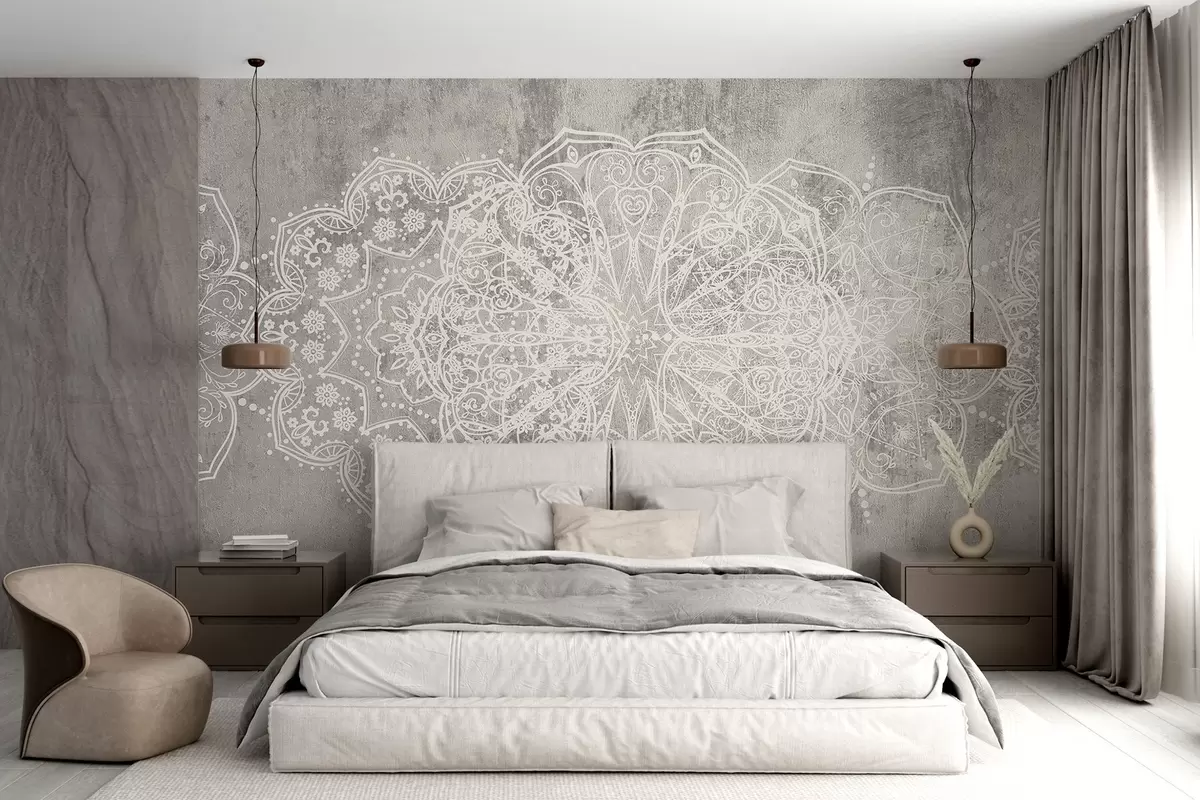 Papel tapiz Un detallado e intrincado patrón de mandala de encaje blanco sobre un fondo de pared gris loft texturizado Nr. w08387