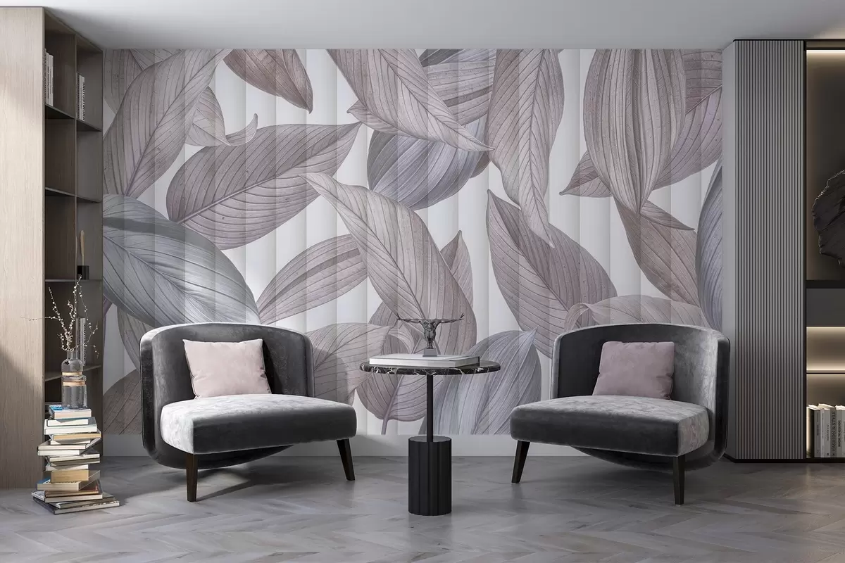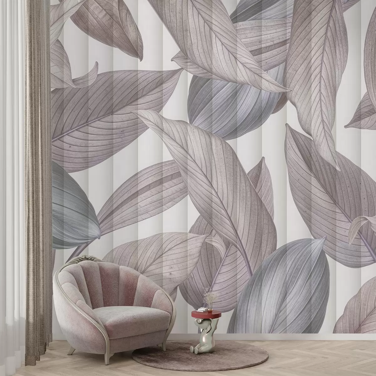 Papel tapiz Hojas abstractas detalladas en tonos azules, grises y rosa pastel sobre fondo claro Nr. w08388v1
