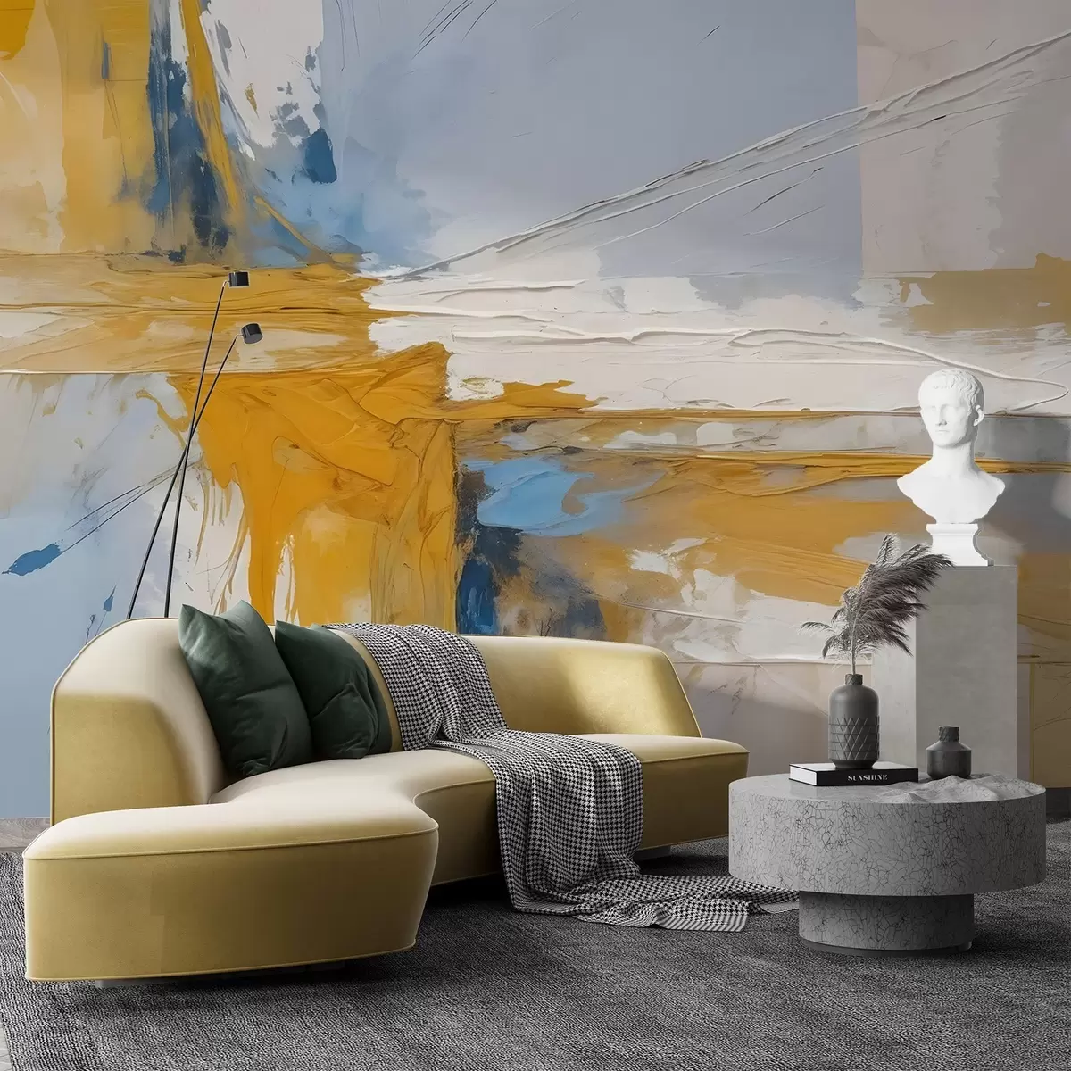 Papel tapiz Composición minimalista de arte abstracto con atrevidas pinceladas de pintura amarilla, azul y blanca Nr. w08414