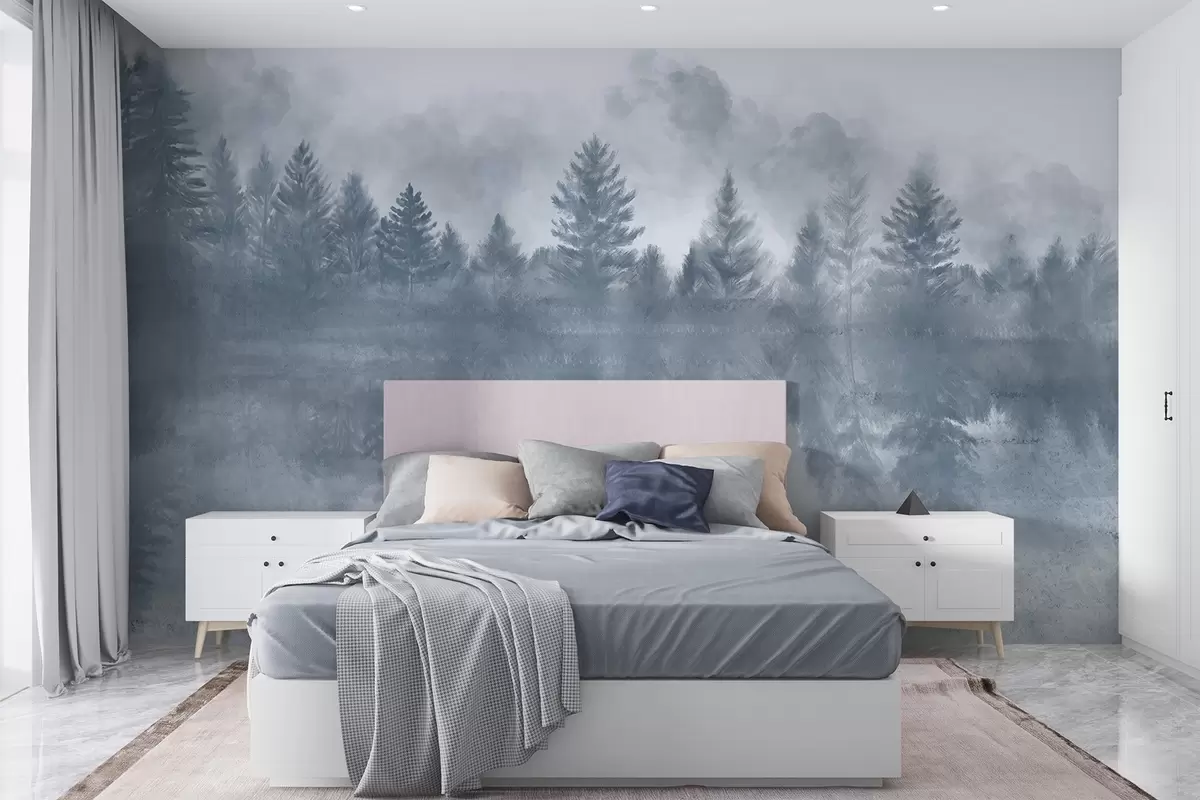 Papel tapiz Un paisaje sereno con un lago helado rodeado de un denso pinar, con una atmósfera brumosa y neblinosa Nr. w08415