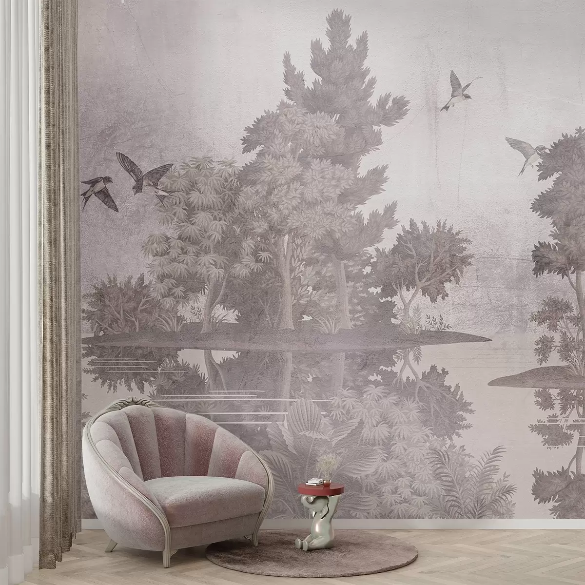Papel tapiz Impresión de un paisaje forestal con un lago rodeado de pinos y otros follajes sobre un fondo beige texturizado Nr. w08426